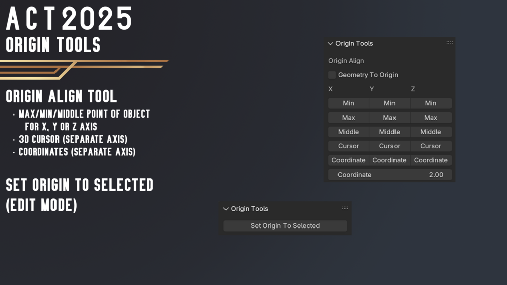 - Align Origin To Max/Min/Middle point of object for X, Y or Z axis