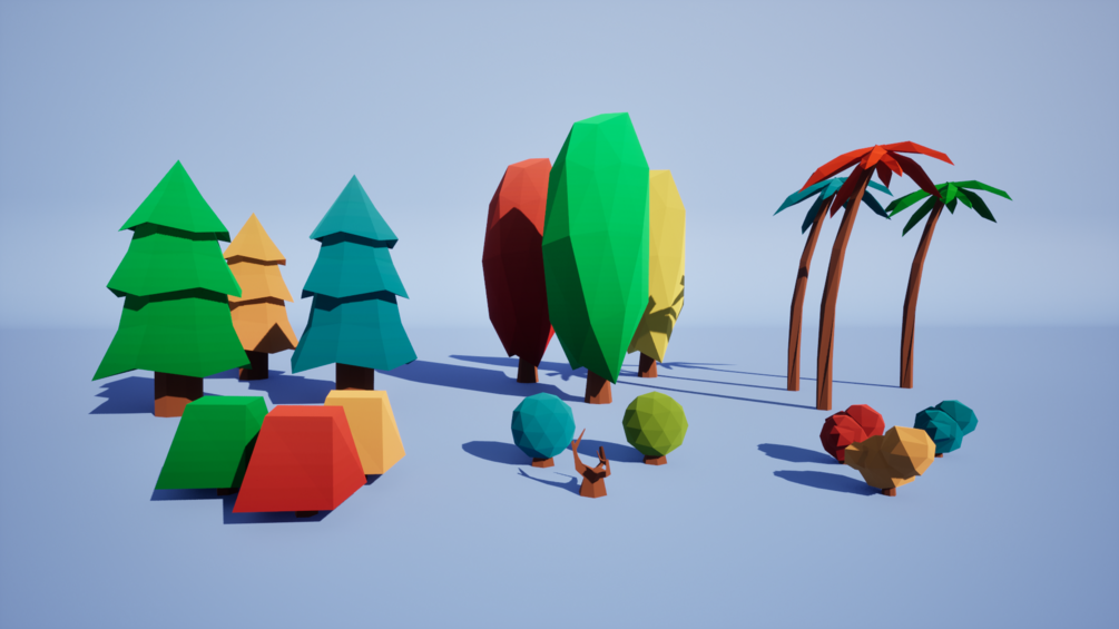 Low-Poly Art style nature pack with trees, bushes, grass, stones and flowers for desktop and mobile projects.