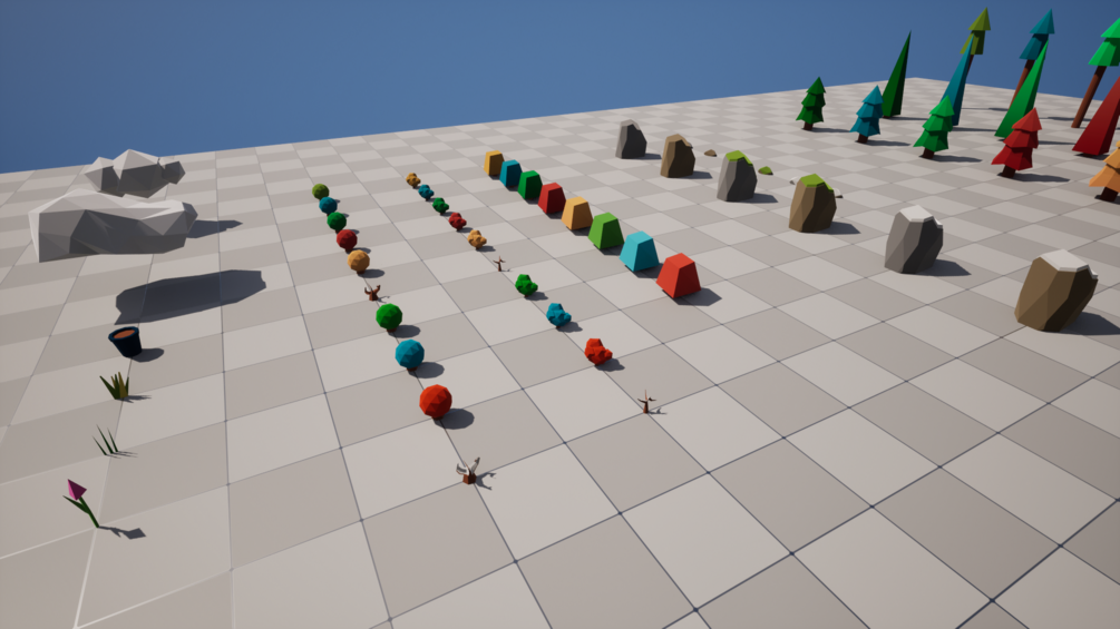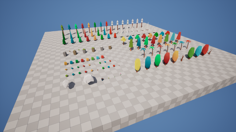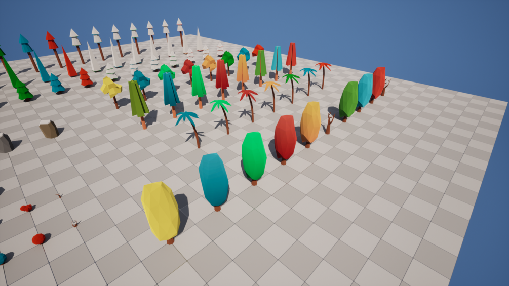 - 7 Trees (75 - 940 tris) x season/color variants = 78 meshes